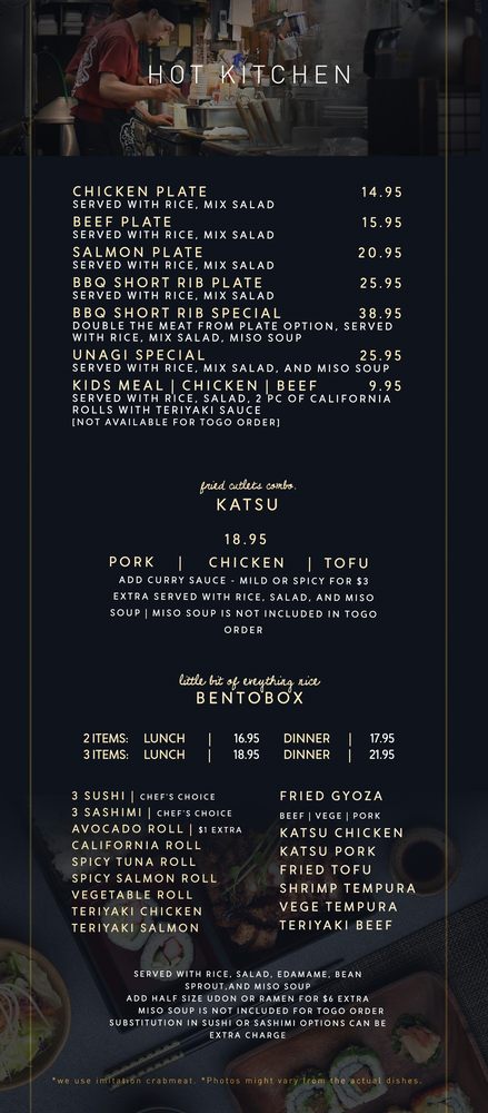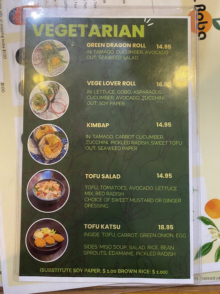 served with deep fried panko breaded tofu, egg, carrot, and green onion mixture with rice, salad and dressing on the side with house made katsu sauce on the side