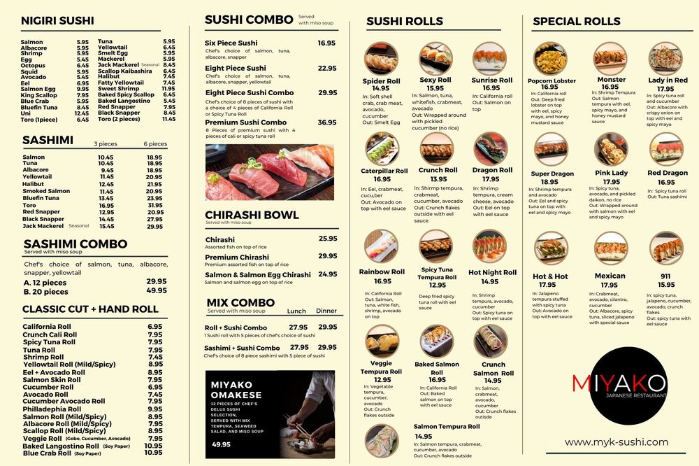 Miyako Restaurant, located in Santa Monica, offers a wide range of Japanese cuisine options with a focus on sushi and noodle dishes. The menu includes appetizers like Edamame and Shrimp Tempura, salads such as Miyako House Salad and Tofu Salad, and noodle dishes like Full Miso Ramen and Full Tonkatsu Ramen. Customers praise the vegetarian options, creative sushi alternatives, and affordable prices. The cozy ambiance and friendly service make it a favorite spot for casual dining or takeout. With unique offerings like boba and ice cream nearby, Miyako Restaurant provides a diverse dining experience for all palates. Lovers of fresh and delicious sushi will find themselves coming back for more at Miyako.